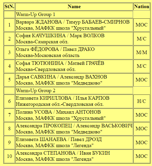 Первыми на лёд выйдут Варвара Жданова и Тимур Бабаев-Смирнов. Последний десятый стартовый номер получили многократные призёры чемпионата Европы Александра Степанова и Иван Букин.