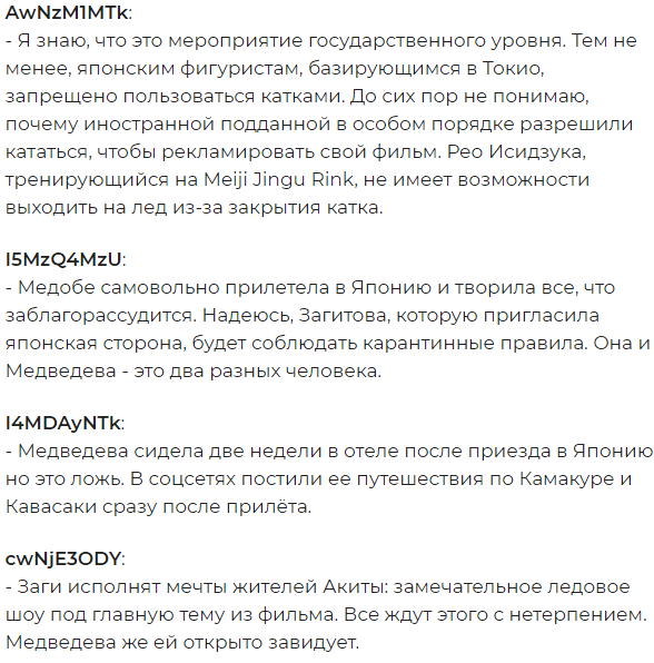 Приезд российской фигуристки вызвал большой интерес со стороны местных болельщиков фигурного катания, которые устроили настоящую дискуссию о том, можно ли приглашать в страну иностранцев во время пандемии.