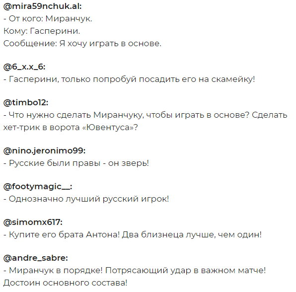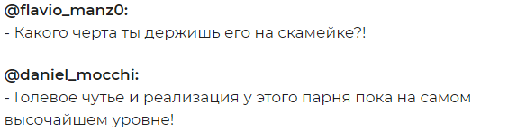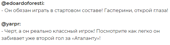Сразу после игры фанатская торсида из Бергамо устроила настоящую дискуссию на просторах Twitter, посвящённую перспективам бывшего железнодорожника в Италии.