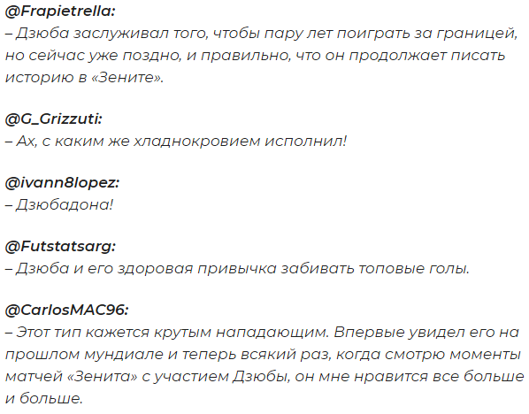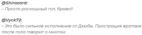 Классный выстрел Дзюбы не прошёл мимо глаз европейских поклонников игры миллионов, которые устроили настоящую дискуссию в зарубежном сегменте Твиттера, высоко оценив талант гиганта из России.