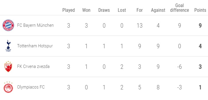 Пока игра не стартовала, скажу, что победа однозначно, гарантированно и мгновенно выведет "Баварию" в 1/8 финала, прочие исходы, конечно, заставят подумать и выждать время. А вот грекам для того, чтобы побороться за выход в весеннюю стадию (что пока, как вы видите из таблицы ниже, возможно), необходимо как минимум не проиграть, рассчитывать на ничью в матче "Тоттенхэма" и "Црвены Звезды", а потом отбирать очки и у тех, и у других в очных дуэлях. Вот такая незатейливая схема получается...