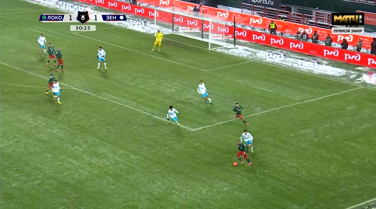 Классно сейчас Дзюба вернулся в штрафную и перехватил передачу у своих ворот, а дальше уже сам разгоняет атаку. Будет угловой.