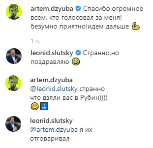 Наставник "Рубина" Леонид Слуцкий обменялся в инстаграм шуточными сообщениями с форвардом "Зенита" Артёмом Дзюбой, которого признали лучшим игроком года второй год подряд.
