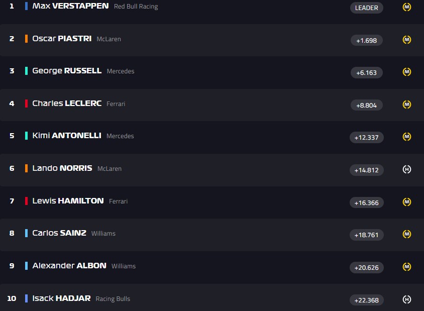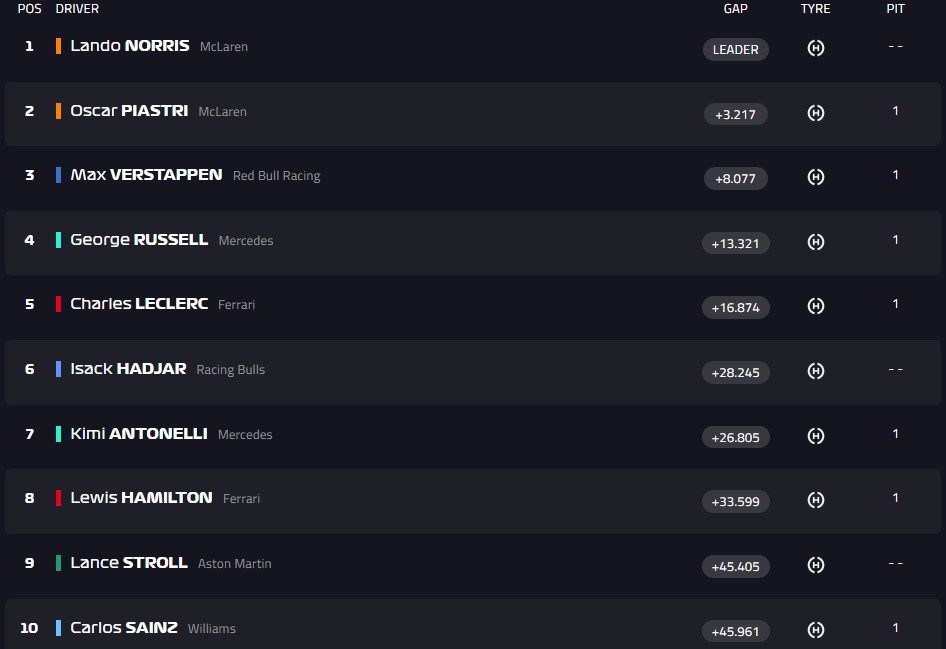 Ушёл пейскар и у нас пока нет изменений в топ-5. И Хэмилтон прошёл Сайнса. Норрис - 8-й.