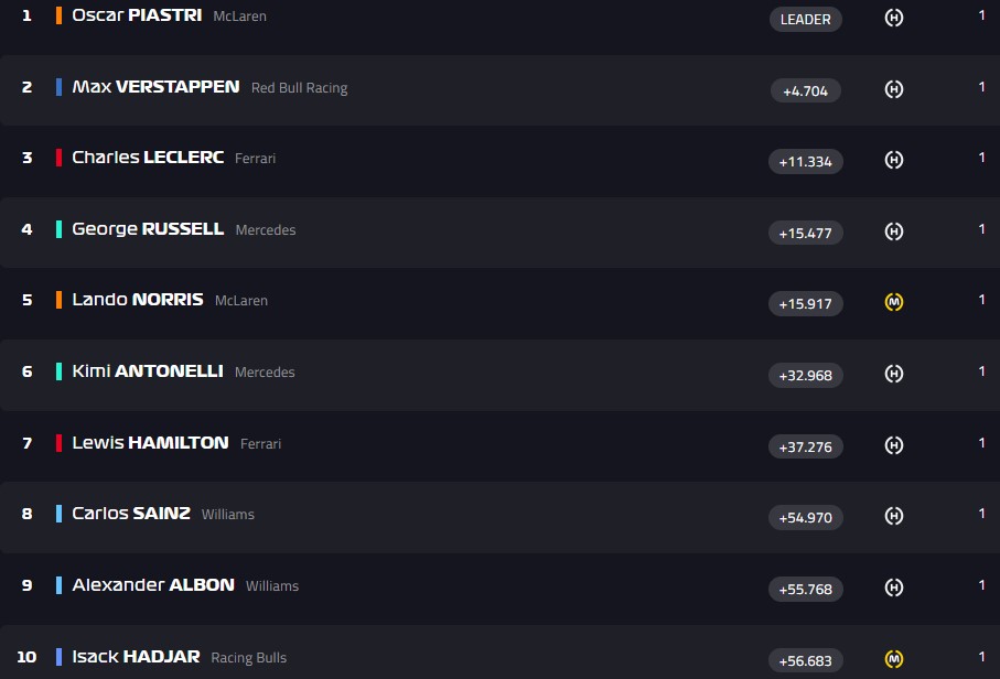 На 2.7 секунды оторвался Ферстаппен от Пиастри, на 7.8 - от Рассела.