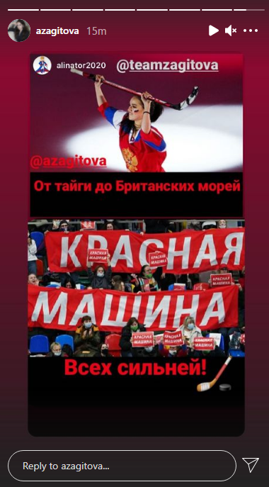 Сразу после поединка олимпийская чемпионка Алина Загитова в сторис своего Instagram опубликовала пост, посвящённый победе любимой команды.