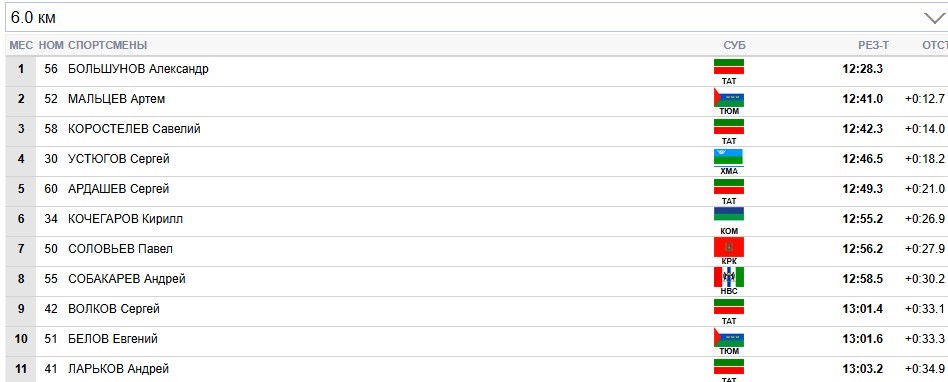 На отсечках 3.6 км и 5 км также лидирует Устюгов, на втором месте Кирилл Кочегаров.