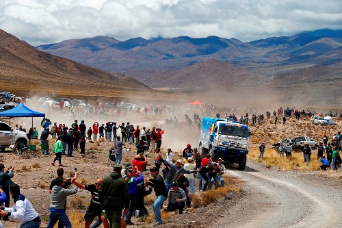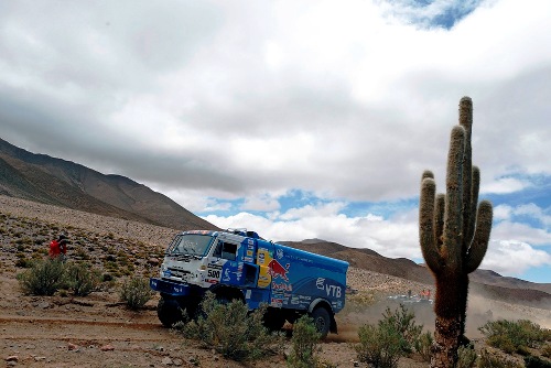 Один раз в неделю из Сальты по направлению к Андам отходит "Трен-де-лас-Нубес" - так называемый "Поезд к облакам", связывающий столицу провинции с затерянным в горах местечком Сан-Антонио-де-лос-Кобрес. Состав движется по берегам глубочайших каньонов, пересекая их на головокружительной высоте по виадукам и, наконец, приходит в пункт назначения расположенный на высоте более 4000 метров. Участникам ралли после дня отдыха, уподобившись Трен-де-лас-Нубес, предстояло 12 января на этапе Сальта-Сальта забраться высоко в горы. Разноцветный экспресс грузового зачета поднялся к облакам. Маршрут был проложен на высотах более 3400 метров, а это означало, что Сальта, расположенная на высоте 1152 метра и вот уже второй день подряд затянутая тучами, оставалась где-то внизу. А значит и дожди, лившие в эти дни и превратившие бивуак Сальты в большущую грязевую ванну, тоже остались где-то внизу. Здесь же в горах было солнечно и сухо. Ожидания, что скоростной спецучасток будет сокращен по погодным условиям не оправдались: экипажам грузовиков предстояло преодолеть изначально запланированные 533 километра достаточно быстрого допа. Старт 7-го этапа гонки был раздельным для участников в категории "Автомобили" и "Грузовики", а мото- и квадрозачеты и вовсе укатили сегодня в Боливию – этакая разведка боем с прицелом, на то, что возможно в будущем в эту страну завернет вся дакаровская братия.