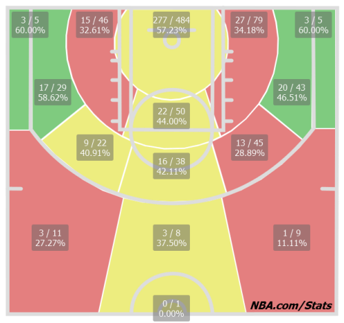 С Хорфордом всё проще и сложнее одновременно. При наличии Смита, которому необходимо было то и дело освобождать место под кольцом для прорыва и эффектного завершения, Эл вынужденно отодвигался чуть выше и весьма эффективно атаковал со средней. Если не обращать внимания на аномально низкий для игрока такого плана процент попадания "from charity stripe", то выглядело всё действительно идеально. Сейчас же всё будет иначе, ведь появился Миллсэп. Да, Хорфорд хорошо работает спиной к кольцу и в нынешних кондициях способен переиграть практически любого оппонента либо силой, либо умом. Но тот, кто говорит, что базовые функции двух стартеров в передней линии теперь дублируются, дважды прав – не забывайте, в чемпионском составе "Флориды" доминиканец был именно что четвёртым номером. То есть рано или поздно его снова потянет наверх. И правильное распределение обязанностей между двумя звёздными бигменами предсказуемо ложится на плечи Буденхольцера. Если Майк с честью выйдет из этой ситуации, то можно будет сказать, что Поп вырастил достойного ученика. Графики же показывают немаловажную деталь – горячие и холодные зоны у Эла и Пола совпадают не везде. Этим нужно грамотно воспользоваться.