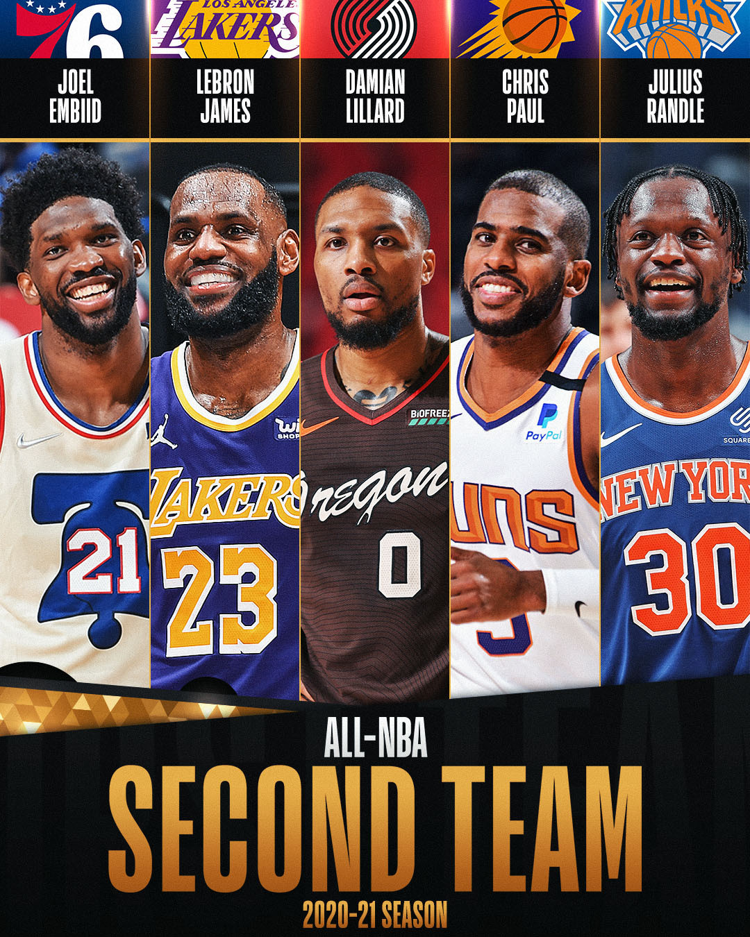 Во второй команде оказались Джулиус Рэндл ("Нью-Йорк"), Джоэл Эмбиид ("Филдельфия"), Дэмиан Лиллард ("Портленд"), Крис Пол ("Феникс") и Леброн Джеймс ("Лейкерс").