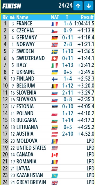 Финиш! Франция выигрывает эстафету, Чехия - вторая, Германия - третья. Новегия - четвёртая.