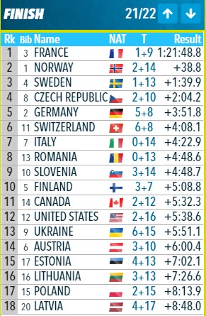13 гонок подряд выиграл до этой эстафеты Йоханнес Бё, как командных, так и личных. 5 побед на этом чемпионате мира, по 3 победы в Антхольце и Рупольдинге, 2 - в Поклюке. Последний раз Бё не смог выиграть в Анси в масс-старте, там он был третьим. Но при этом продолжается медальная серия. На пьедестале Бё не был только в самой первой гонке этого сезона и далее были 23 медальные гонки. И среди них 20 побед в сезоне, 1 сегодняшнее серебро, 2 бронзы. Сегодня немного подвели партнёры, зашедшие на 2 круга. Посмотрим, что принесёт нам масс-старт. Трансляция завершена, провёл её Вячеслав Горбачёв, всего хорошего.