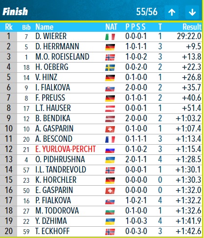 Херрманн здесь же идёт третьей, на 11-й позиции расположилась Юрлова-Перхт, Куклина поднялась в ТОП-20. У Ларисы 0 промахов, она проигрывает 1:16.2. Таким образом, 28 позиций она отыграла!