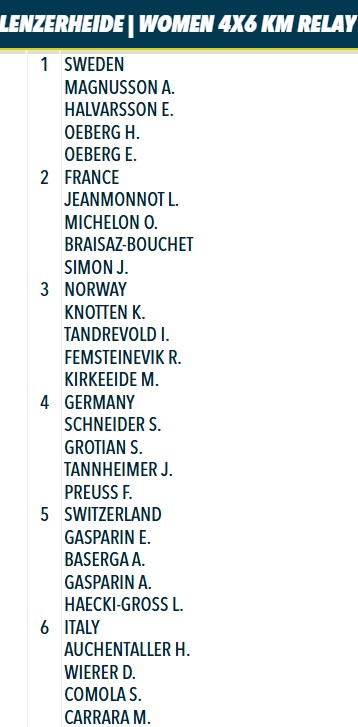 Передача эстафеты: Франция первая, Словения - вторая, Швеция - третья.