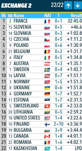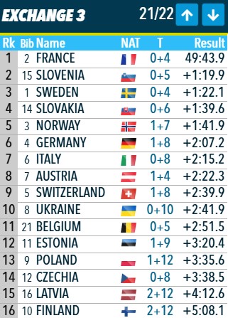 Передача эстафеты: Франция первая, Словения - вторая, Словакия - третья.