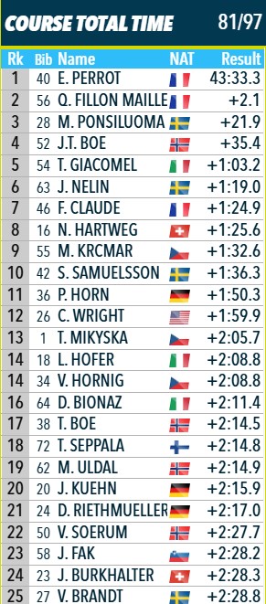 Джакомель стерляет точно на втором рубеже и выходит в лидеры, опережая Перро на 51 секунду.