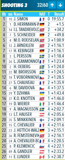 Промах у Херрманн, Симон с нулём и Жюли выходит на первое место. Немка отстаёт на 1.5 секунды.