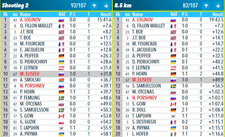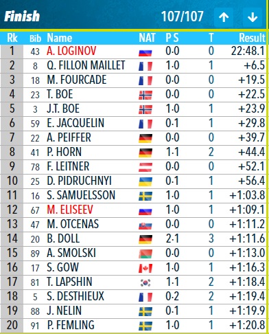 Ну вот! Как под копирку, и один, и другой допустили по промаху. По скорости Матвей выглядит предпочтительнее, так как по итогам своих 150 лишних метров смог остановиться на 17-м месте в 20.5 секундах от времени Жаклена, кстати, который ранее завершил стрельбу "на ноль". Гараничев же идёт 36-м, у него +39.0.