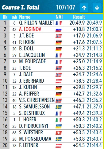 Ух ты!!! Кентен Фийон-Майе перехватывает лидерство! Он преодолел 10 километров за 22:54.6, что на 17.4 секунды быстрее, чем у Йоханнеса Бё. Тем самым, Поршнев двигается ещё ниже по протоколу. Давайте посмотрим, что у Логинова происходит.