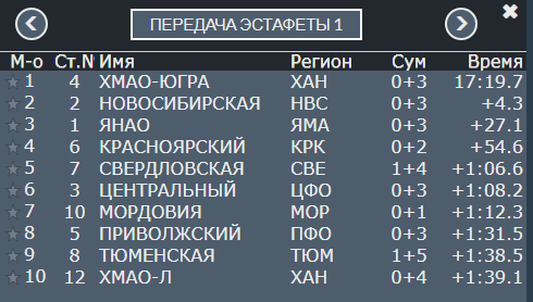 Состоялась третья передача эстафеты. ХМАО-Югра движется к золоту. Отрыв спортсменов из Ханты-Мансийска превышает 1 минуту 11 секунд! Второе место у Красноярского края, третье - у Свердловской области.