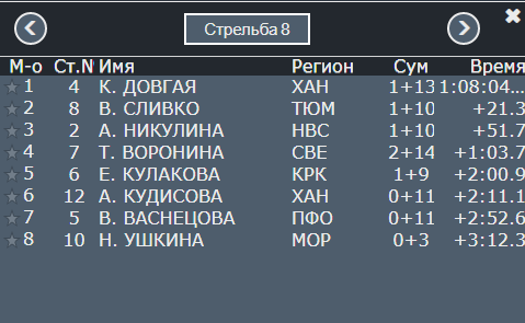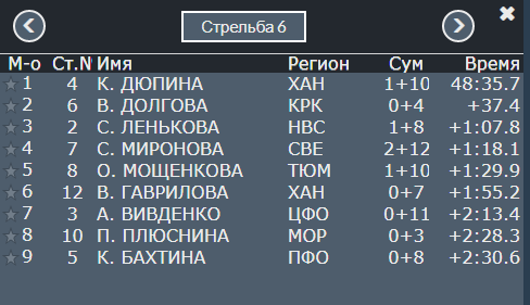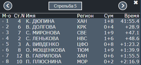Дюпина допустила ещё два промаха. Но остаётся она в лидерах. Второе место занимает Долгова, отстаёт она на 37,4 секунды. Третья - Ленькова из Новосибирской области. Но отставание там уже больше минуты.