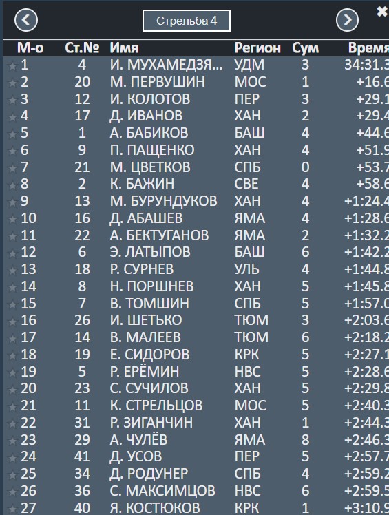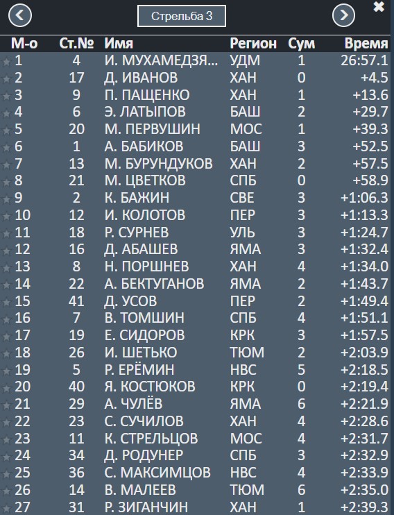 Мухамедзянов отработал чисто, но стрелял долго и отстаёт от Латыпова на 10 секунд. Бабиков ушёл на круг и опустился на 4-е место, а на третье вышел Иванов.