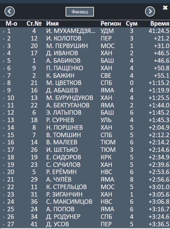 Финиш! Мухамедзянов побеждает, Колотов - второй, Первушин - третий. Гонка завершена.