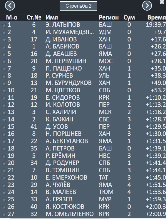 Латыпов и Бабиков остались лидировать и после первого огневого рубежа и также вместе с ними Мухамедзянов. Сурнев и Халили отстают на 10 секунд.
