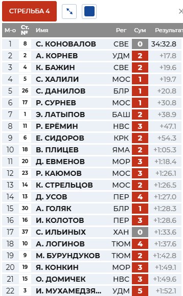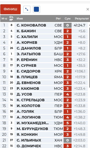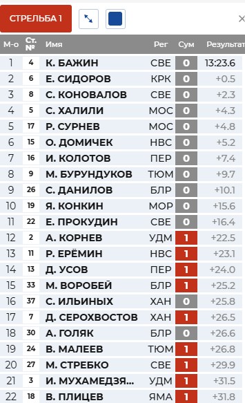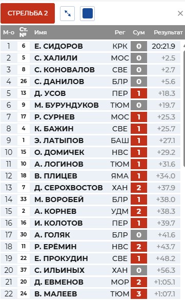 Сидоров отстрелялся точно и вашел в лидеры. Коновалов и Халили идут за ним.