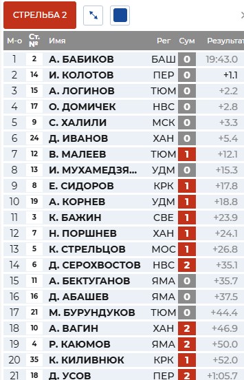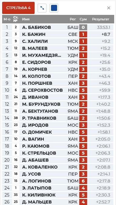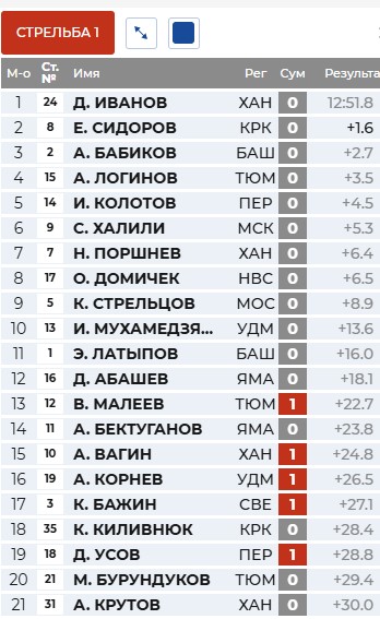 Бажин лидирует перед первой стрельбой, Серохвостов, Бабиков и Латыпов сразу за ним.