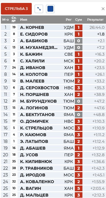 Сидоров мажет 1 раз, Корнев - 2 раза. Бабиков точен и уходит на трассу первым.