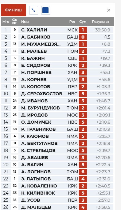 В секунде Халили от Бабикова, Мухамедзянов в 5 секундах.