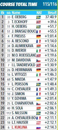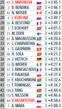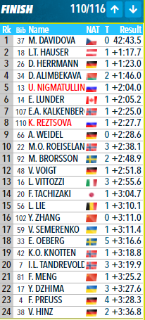 Давидова финишировала третьей, Хаузер вторая, далее Херманн, Алимбекова и Нигматуллина. Ульяна пятая. Куклина пока 15-я.