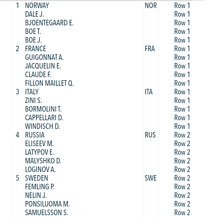 Финиш! На последнем метре дистанции Бё выскочил из-за спины Долля и одержал победу! Германия вторая, Франция -третья. Канада на 4-м месте, Чехия - 5-я, Россия - шестая. Гонка завершена.