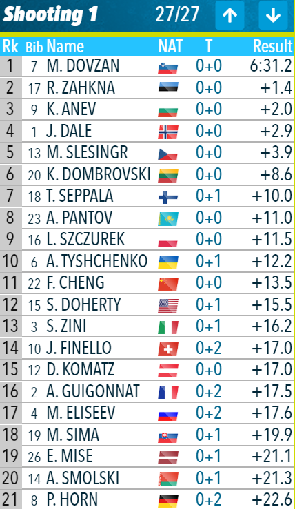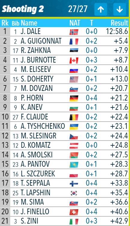 Гигона, Захна, Бурнотте и Елисеев также отработали без промаха. Матвей поднимается на 5 место, отставание от Дале - 10 секунд.