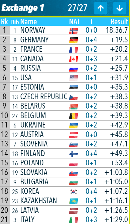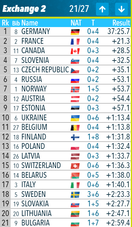 Кюн пролетел последний отрезок и привёз 21 секунду Жаклену, Латыпов подпустил к себе Норвегию, проигрыш уже 53 секунды.