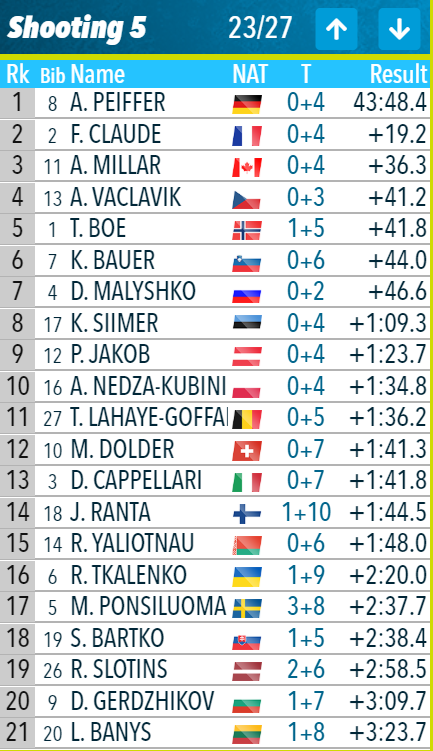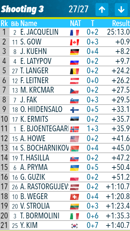 Жаклен, Гоу, Кюн и Латыпов отстрелялись точно! Россиянин в первой четвёрке, отставание от лидера Жаклена - 9.7 секунды.