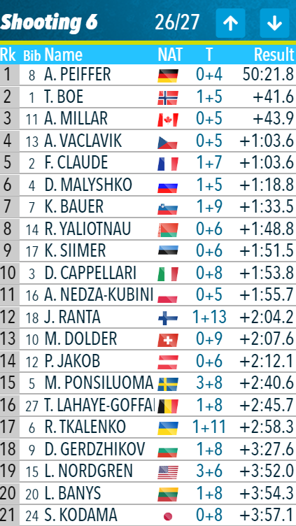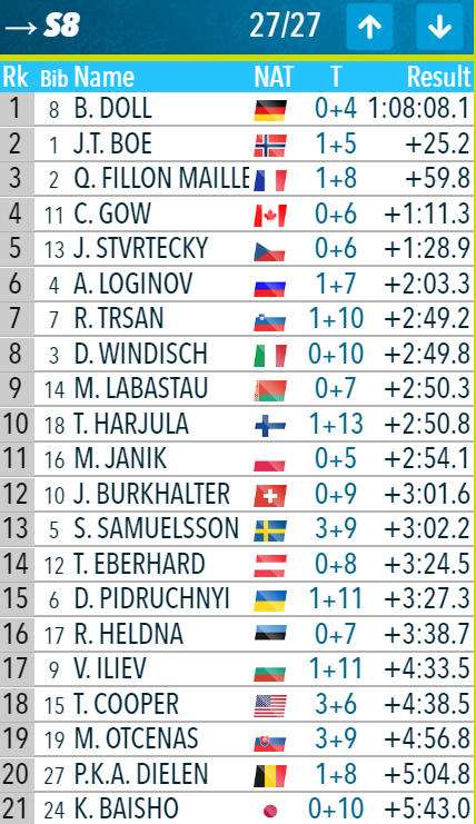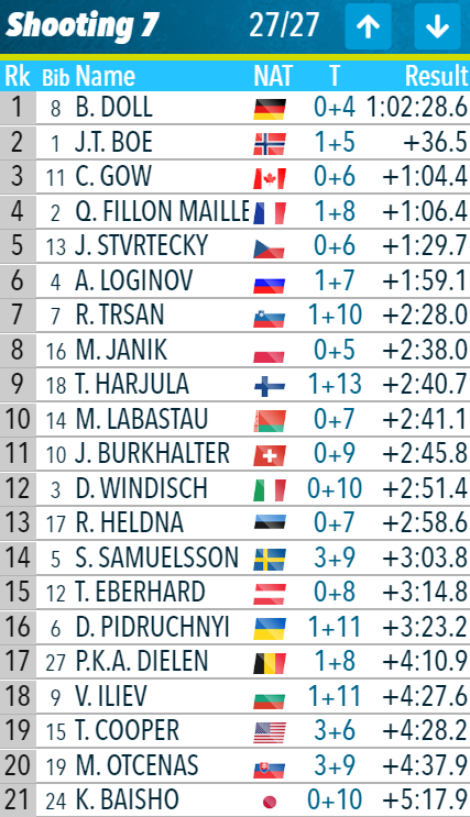 Точно отстрелялись Долль и Йоханнес Бё, разрыв между ними не изменился.