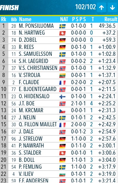 У Нелина и Понсилуомы последним патроном промах на стойке. У Йеспера 10-е место, у Мартина - 5-е.