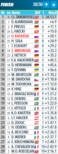 Хекки финишировала четвёртой, Кайшева - пятой, далее Сола и Экхофф. Миронова - восьмая - гонка завершена.
