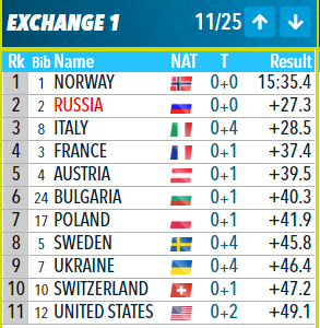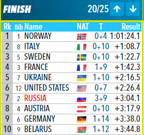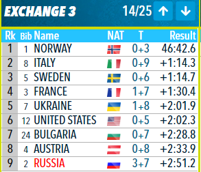 Сборная России заходит на три штрафных круга в смешанной эстафете и занимает лишь седьмое место