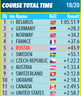 Россия проиграла 4 секунды лидерам на данном отрезке и передала эстафету четвёртой.