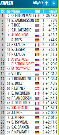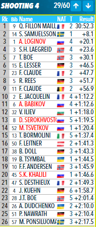 Реальный шанс выиграть гонку сегондя упустил Логинов, а затем проиграл дуэль за бронзу двум норвежцам. Неудачная гонка, Логинов был в шаге от победы. Остальные россияне выступили для себя хорошо. Бабиков снова в топ-10, Серохвостов много настрелял, но снова показал хорошую скорость и пришёл 11-м, а Цветков отыграл 40 позиции. Халили отыграл 25 позиций. В итоге в топ-20 вошли 5 россиян. Трансляция завершена, провёл её Вячеслав Горбачёв, всего хорошего.