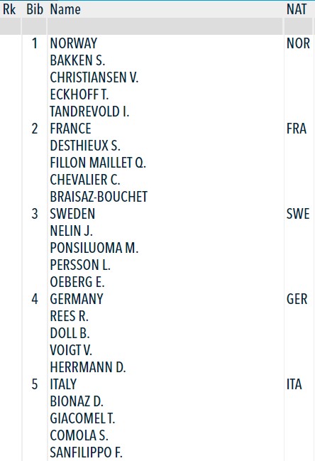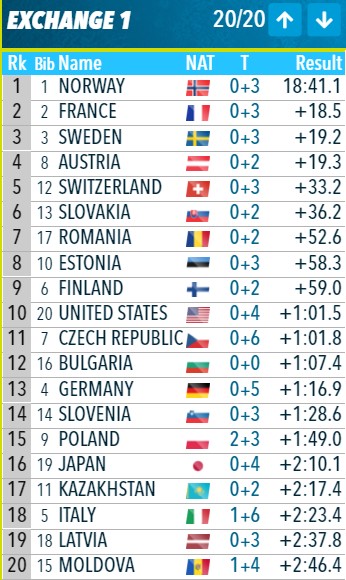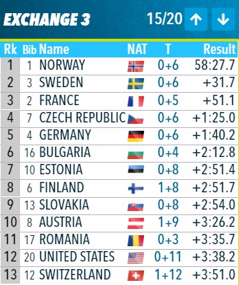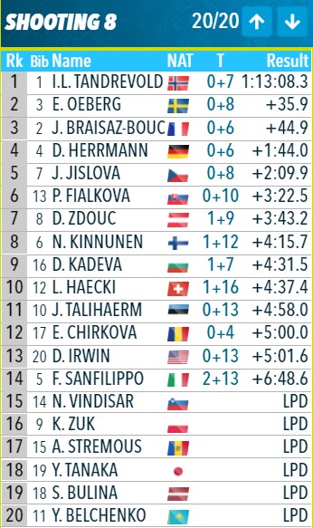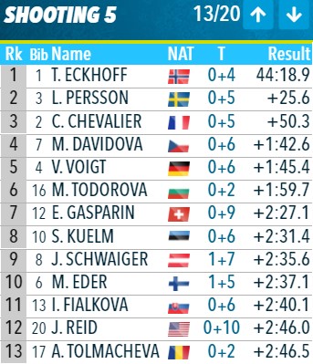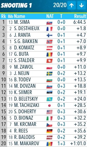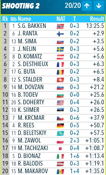 Сима из Словакии выходит на первое место, за ним Дестье и Ранта. У Баккена один патрон, у Риза и Нелина - два.