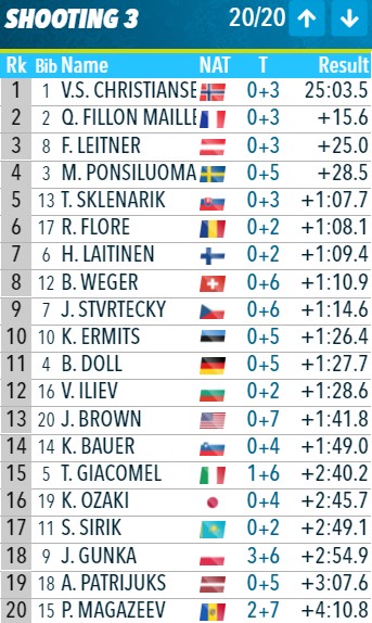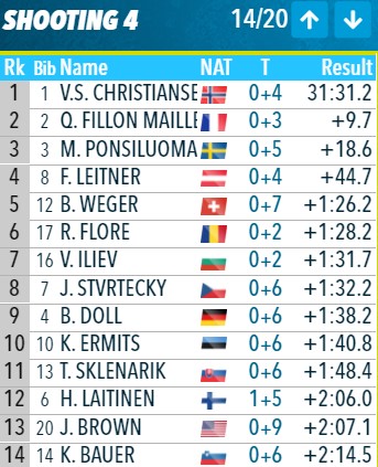Точно отстрелялись Кристиансен и Фийон Майе, а у Понсилуомы 2 патрона. Лейтнер выходит на третье место.
