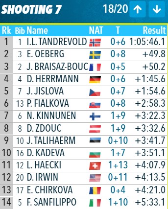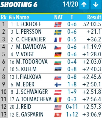 Два патрона у Экхофф, но она осталась лидером. Один - у Перссон. Шевалье - чисто. Все они сохранили свои позиции.