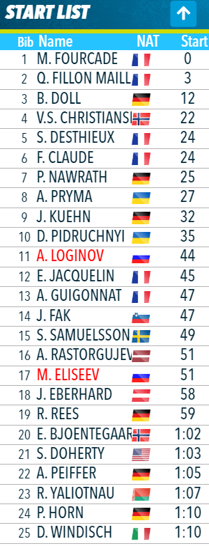 Состав сборной России: Состав сборной России: Александр Логинов (11-й), Матвей Елисеев (17-й), Евгений Гараничев (53-й), Эдуард Латыпов (55-й).