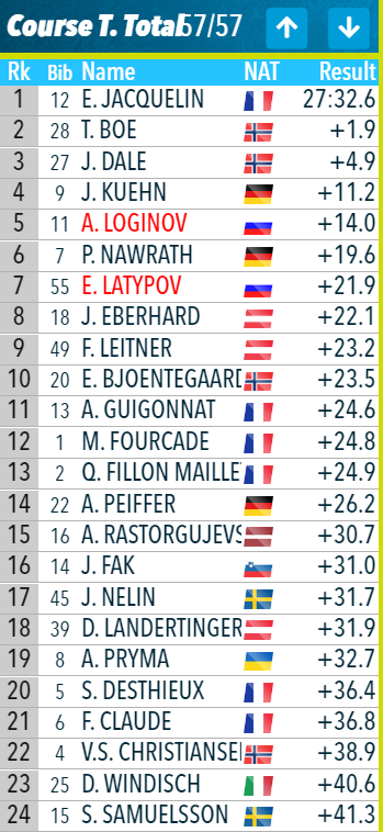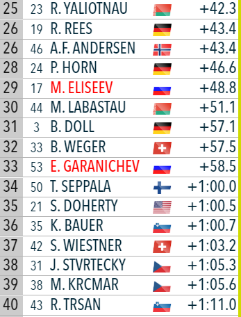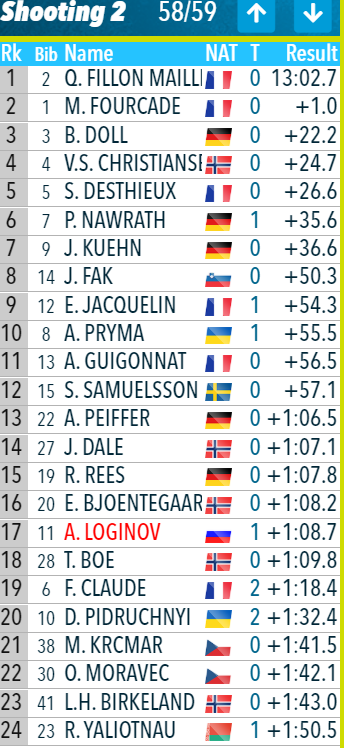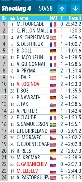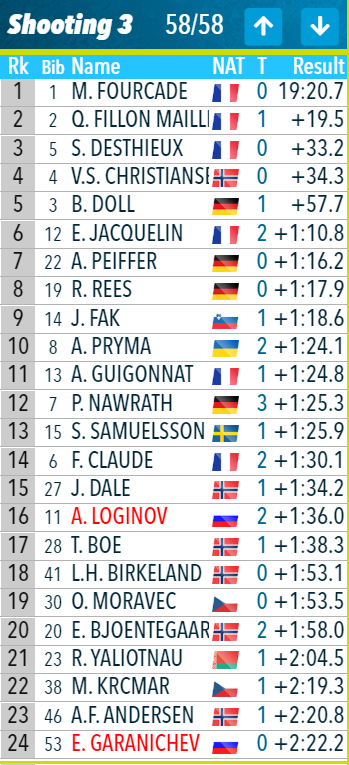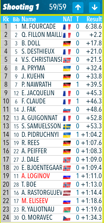 Точная стрельба от Логинова, он поднимается на 17 место, а вот два круга Елисеева отбрасывают Матвея на 33 позицию.