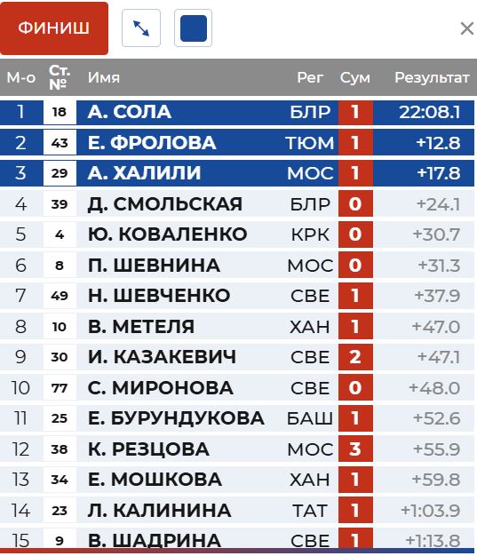 Сола опережает на 18 секунд Фролову и на 23 секунды Смольскую.