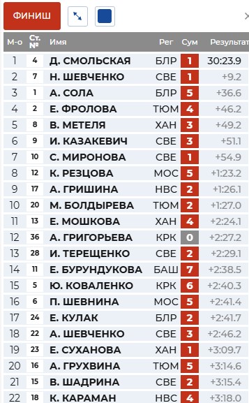 Сола опережает на 18 секунд Фролову и на 23 секунды Смольскую.